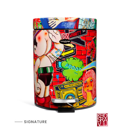 Dieser farbenfrohe Badezimmermülleimer entführt uns in die poppige und dynamische Welt des talentierten Guive Khosravi. "Vanity Fair" lässt uns in seiner Version für TohaaDesign eine Explosion aus flammenden Farben und origineller Gestaltung erleben.