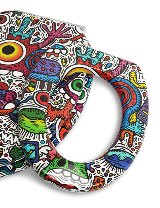 Entdecken Sie den Toilettensitz Crazy Maniac für Kinder - designt von dem talentierten Künstler Skwak, dessen Werke weltweit ausgestellt werden. Ein unentbehrliches Accessoire, um Ihre Kinder bei diesem wichtigen Schritt, dem Gang zur Toilette, zu unterstützen. Ein spielerisch bunter Kindersitz – entworfen als Kunstobjekt für Eltern und als lustige Erfahrung für Kinder, die von diesem Design bestimmt begeistert sofort sein werden.