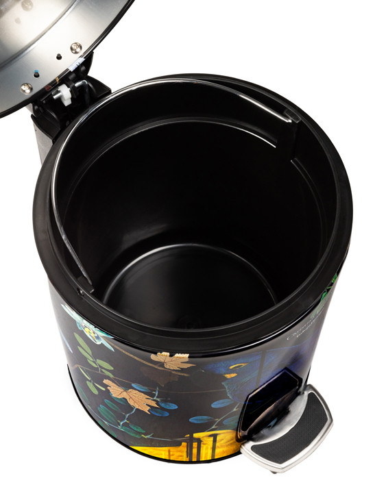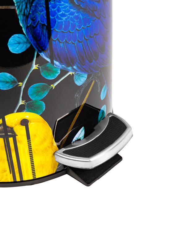 La Maison Christian Lacroix s’associe à la marque TohaaDesign pour vous proposer un modèle de poubelle de salle de bain unique. Ce dessin emblématique de la prestigieuse Maison Lacroix "Birds Sinfonia", au fond noir intense, s’anime d’une nuée d’oiseaux aux plumages chatoyants retraçant les portées musicales de leur propre chant.