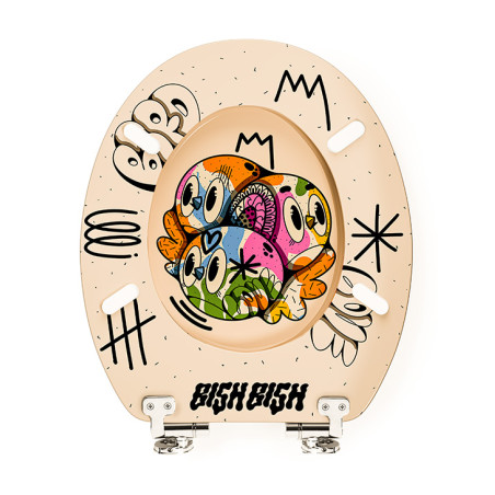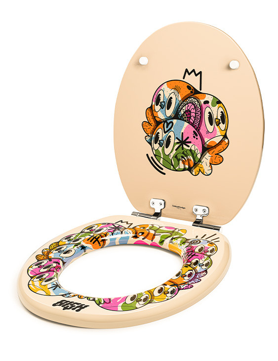 L’asse WC Color Bomb, secondo modello esclusivo firmato dall’artista Bishop Parigo per TohaaDesign, esplode di colori grazie al suo fondo pastello delicato e ai suoi uccelli flashy pieni di energia. Il contrasto tra le tonalità morbide e gli accenti vivaci crea un design grafico forte e immediatamente riconoscibile. Un asse per toilette originale che dona un tocco artistico e inaspettato all’ambiente bagno.